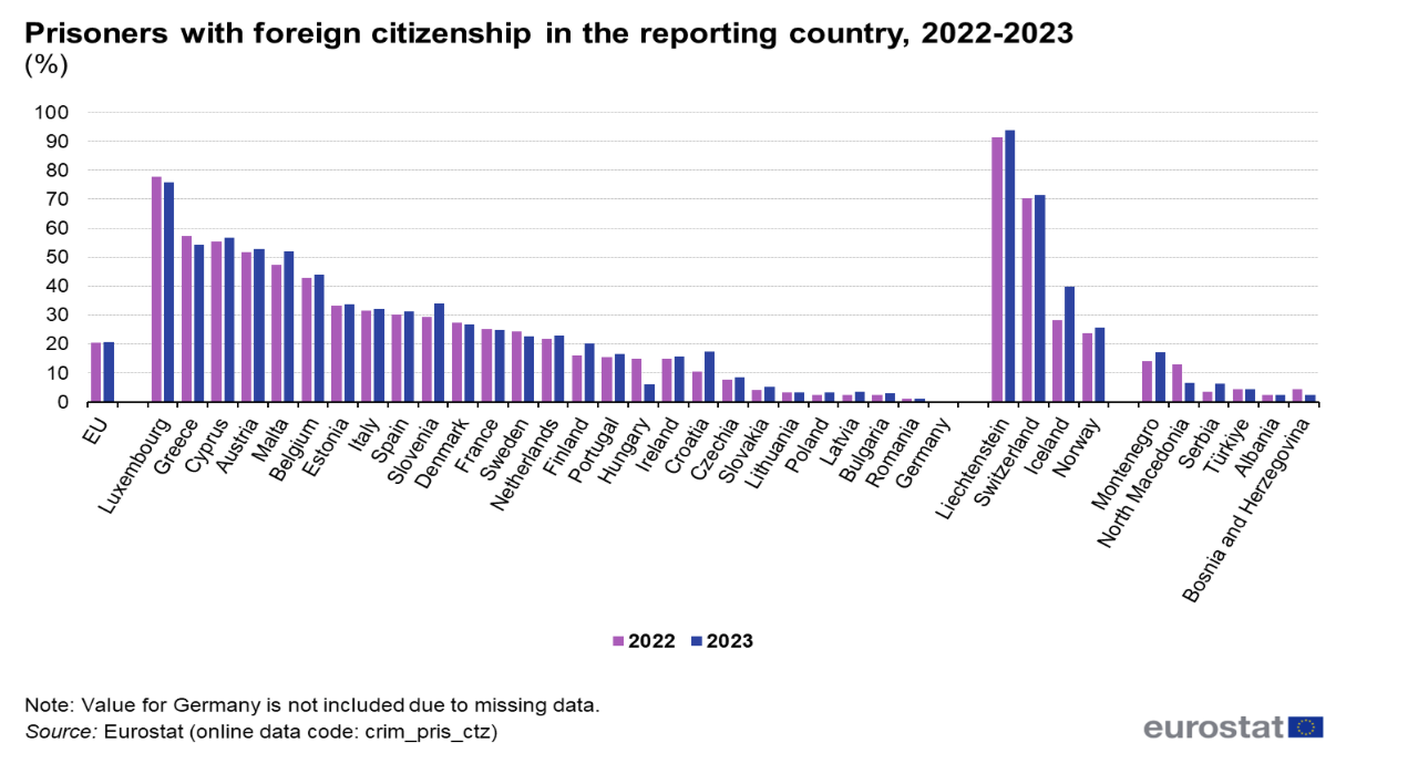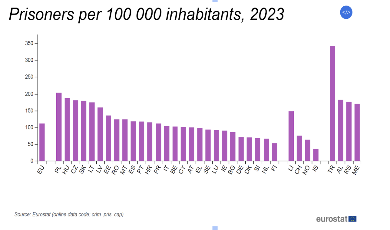 Mattresses in bathrooms, prisoners “having to eat their meals standing up or sitting on the floor, sometimes with no access to basic amenities like pillows or clothes-washing facilities,” and even the rape and murder of prisoners by their own bunkmates in overcrowded prison cells are not the anecdotes of a survivor of the gulags but rather features of everyday life for prisoners in more than half of the European Union’s member states. According to the most recent Eurostat survey, taken in 2023, 14 countries had some extra capacity while 13 countries had none at all and had to overcrowd existing cells. However, more recent data from the World Prison Brief adds Portugal and Hungary to the growing number of EU member states with prison occupancy rates above 100%.