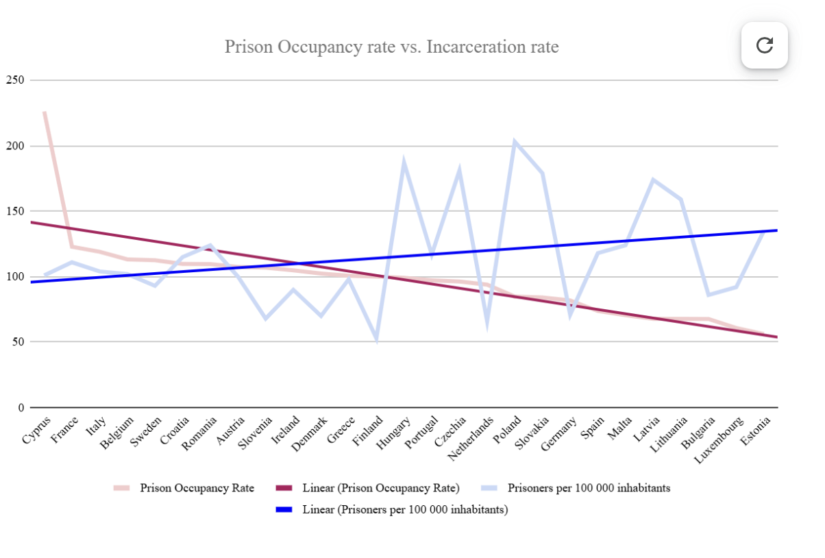 In that same year, Poland had the highest incarceration rate in the EU with 203 prisoners for every 100,000 inhabitants. However, their occupancy rate was only 84.7%, well below the EU average of 94.6%, suggesting a comfortable margin of available capacity despite a comparatively large prison population. These examples have come from the statistical extremes, yet a cursory comparison of the below graphs will demonstrate that incarceration rates and occupancy levels do not necessarily move together, and that countries with similar incarceration profiles can nonetheless experience markedly different levels of prison overcrowding. In fact as my graph below proves*, these two variables are negatively correlated.