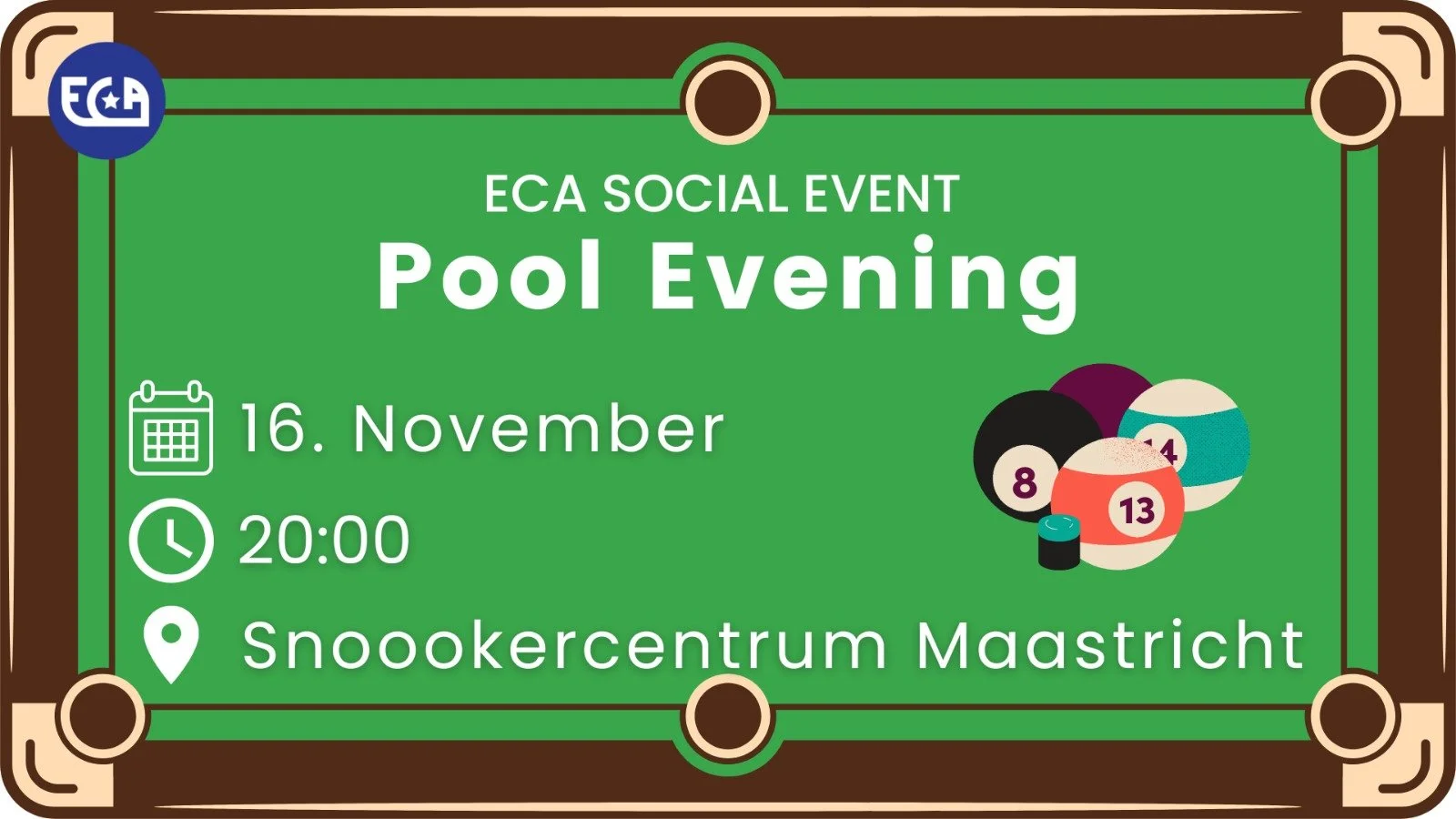 Join ECA for a game of pool and have fun with our fellow members over a billiard table. Enjoy a drink on us and use this opportunity to have a unique study break like no other. If you think that your billiard skills are limited, then we have good news for you. Just make sure to sign up, and you can benefit from a quick tutorial of the rules and basic techniques of billiard. For the price of just €9, you will have access to more than an hour of playtime, necessary training and a drink included in the price. There is only a limited number of spots available, so use the link to sign up as soon as possible!
